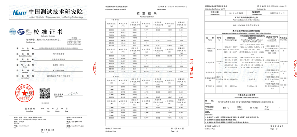 校準是確保測量儀器保持性能、量值準確傳遞的核心環節。本次對KDJB-1200Y的校準,嚴格依據 《JJG 1112-2015 繼電保護測試儀》 國家計量檢定規程進行,由中國測試技術研究院在受控的實驗室環境(溫度20.0℃,濕度55% RH)下完成。校準過程使用了包括三相標準功率電能表、高精度數字多用表、通用計數器、直流標準電阻器及數字毫秒儀等一系列可溯源至國家計量基準的頂級標準器具,確保了校準結果的權威性與溯源性。